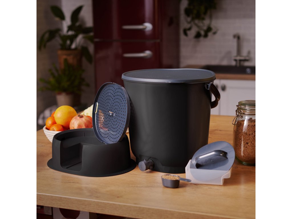 - Snadné použití: Stačí vkládat odpad, posypávat Bokashi otrubami a pravidelně vypouštět fermentační tekutinu = Bokashi džus.