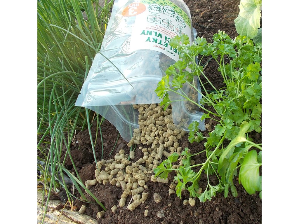 GreenWool peletky z ovčí vlny působí v době vegetace jako dlouhodobé hnojivo, snižují množství zálivkové vody a provzdušnují půdu. Jsou yrobeny ze 100% přírodní, neupravené ovčí vlny pocházející z chovů v České republice. Při výrobě je vlna mechanicky drcena na malé částečky a poté lisována do peletek.