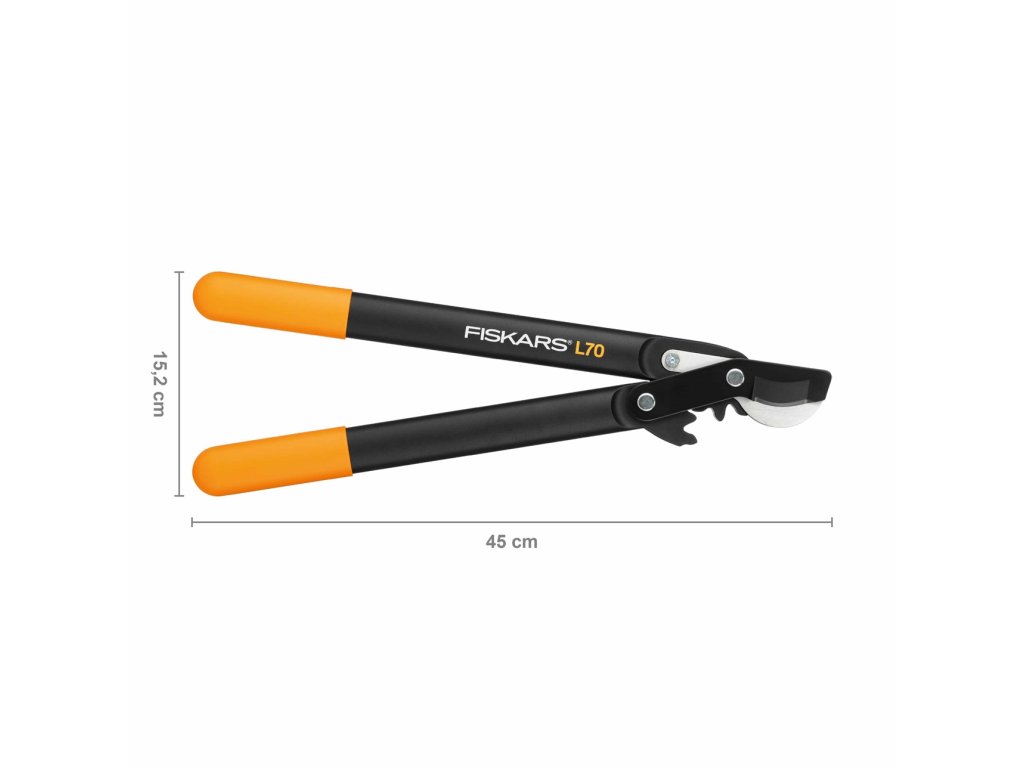 Nůžky na silné větve s převodem Fiskars mají perfektně vybroušenou ostrou čepel. Čepel je potažená kluznou vrstvou PTFE, střihá proti spodní čepeli, která je vytvarována tak, aby větev při střihání nevyjížděla. Nůžky jsou vhodné na čerstvé větve. Snadno uchopíte větev mezi čepele. Max. střihaný průměr 38 mm. Délka: 450 mm. Hmotnost: 490 g. Původní Fiskars číslo: 112190. Označení: (S) L70